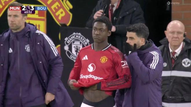 然而,让球迷郁闷的还不只是比分。比赛当晚,科比·梅努的哥哥乔丹·梅努现身老特拉福德,却被拍到身穿一件黑色T恤,上面用极简字体印着一句直白口号: “放梅努离队(Free Kobbie Mainoo)。”